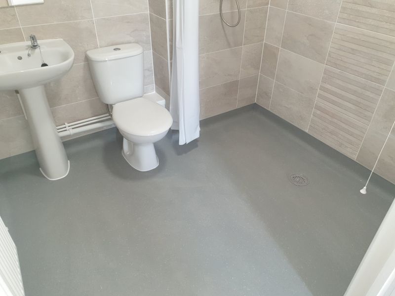 To all en suite bathrooms and shower areas: Polyflor anti slip Quattro vinyl sheet 350 sqm