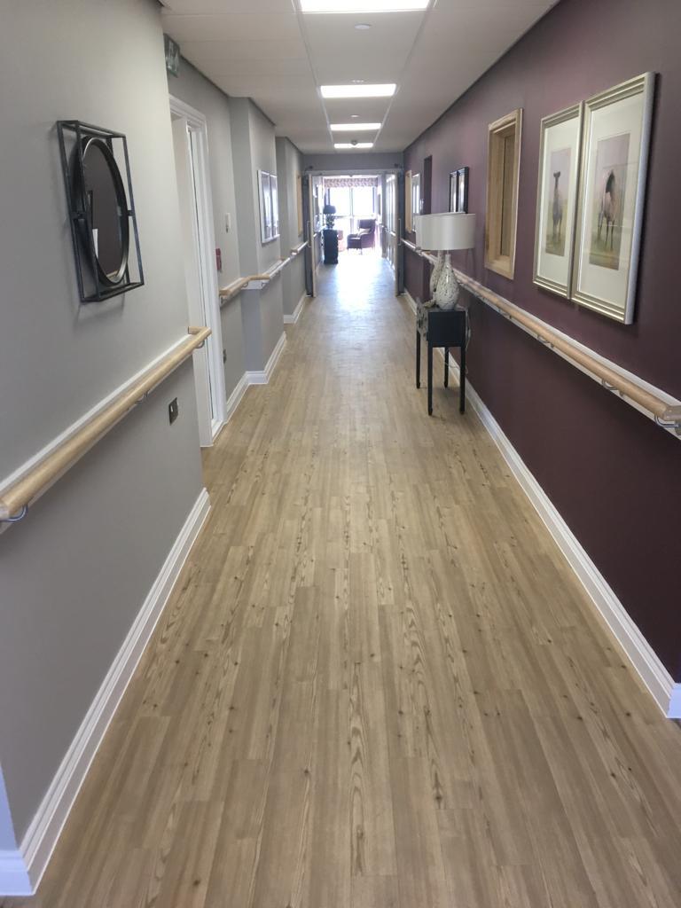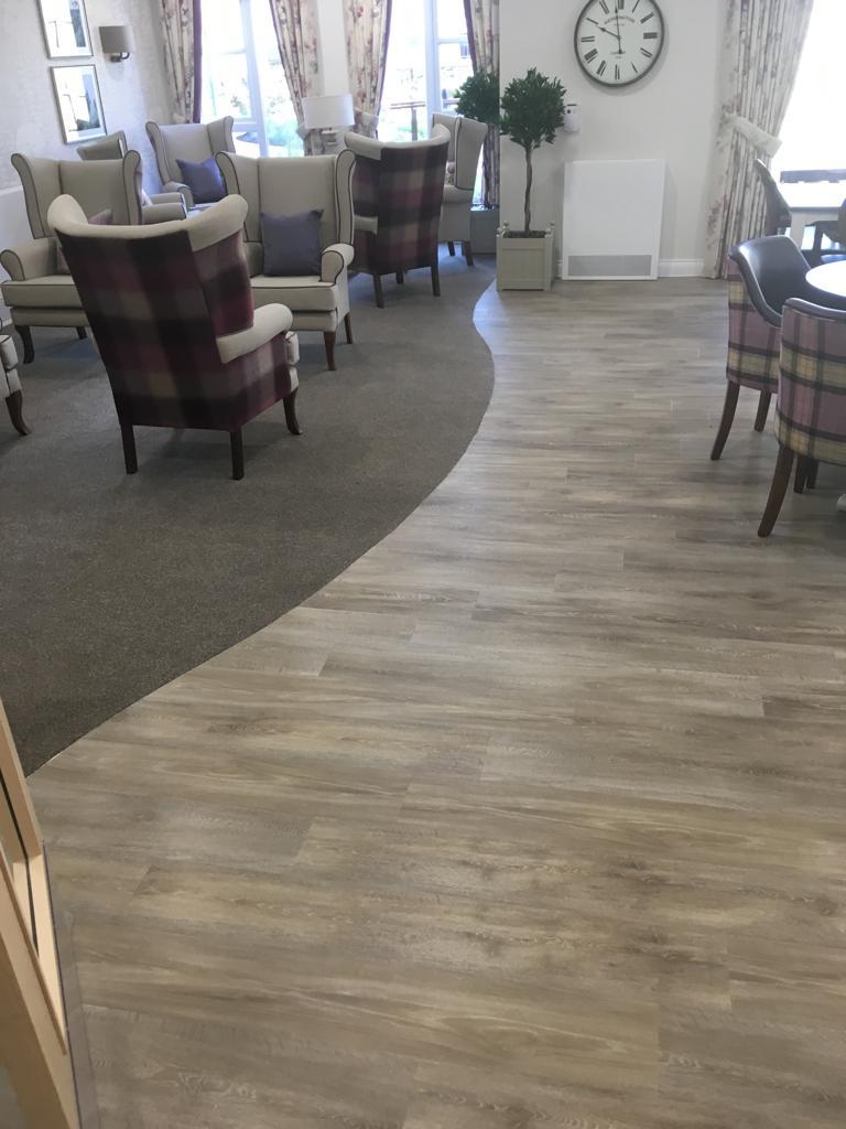 Installed a number of vinyl products including Amtico Spacia Acoustic wood Planking , Tarkett Safety Vinyl sheet, Polyflor Beveline integrated with Danfloor Equinox Tones to Lounges and stairwell areas.