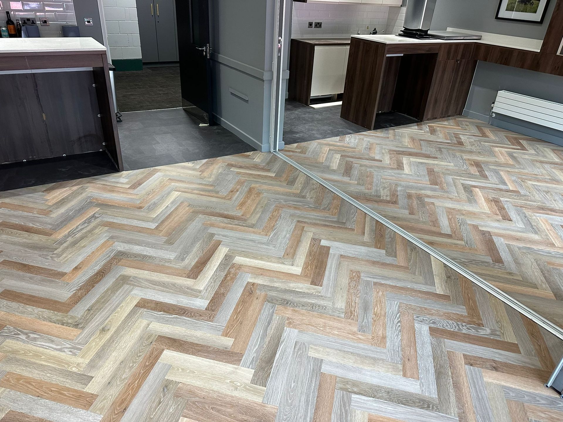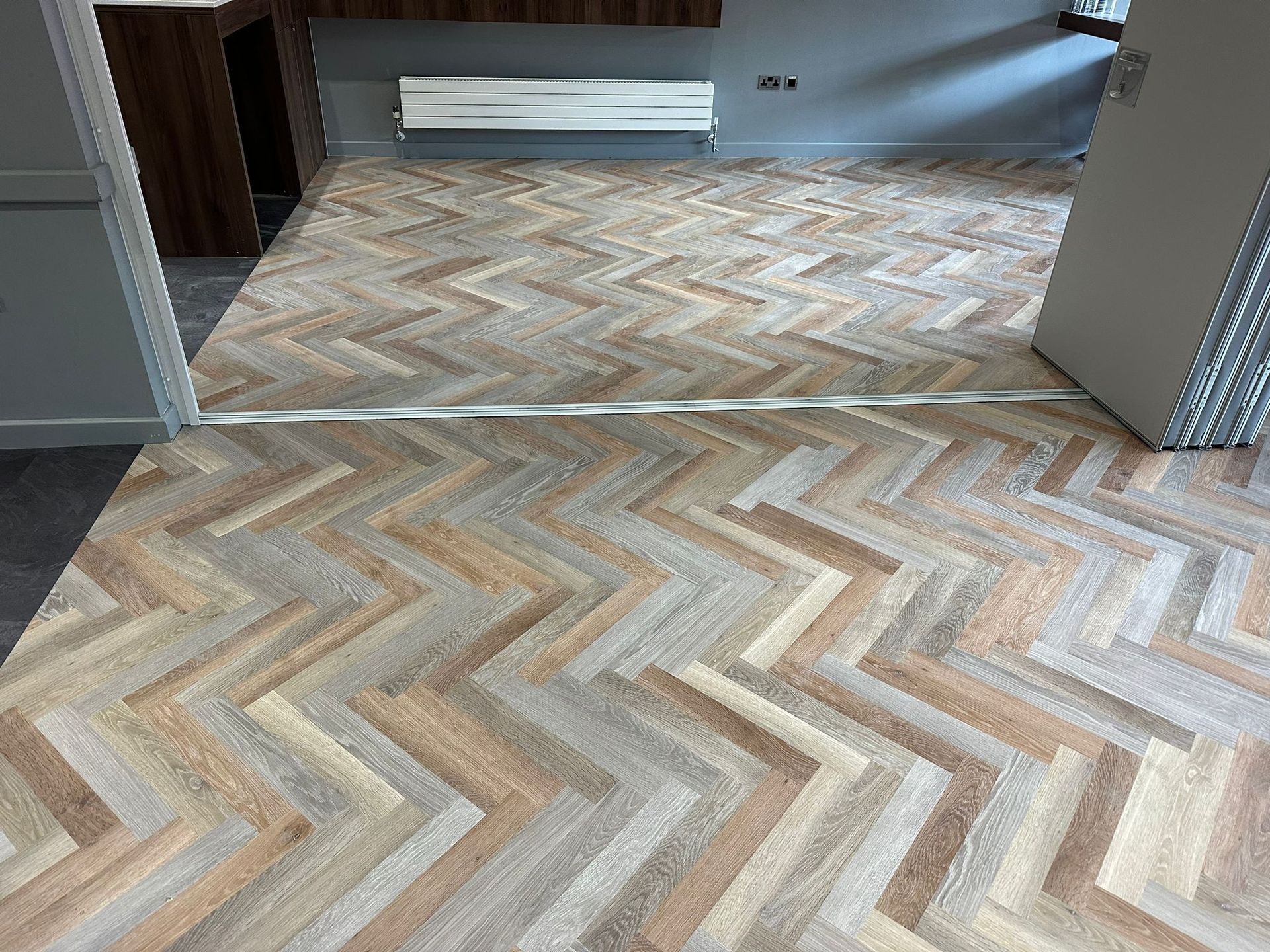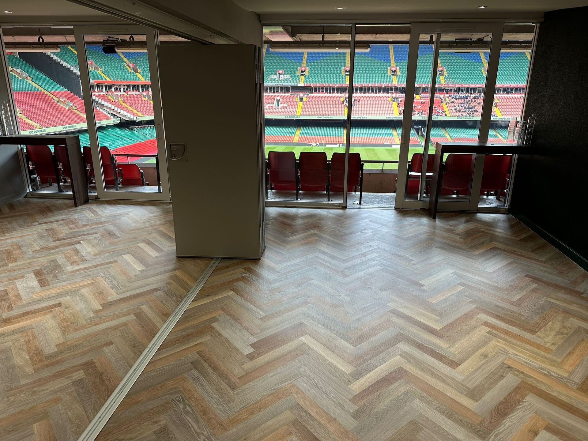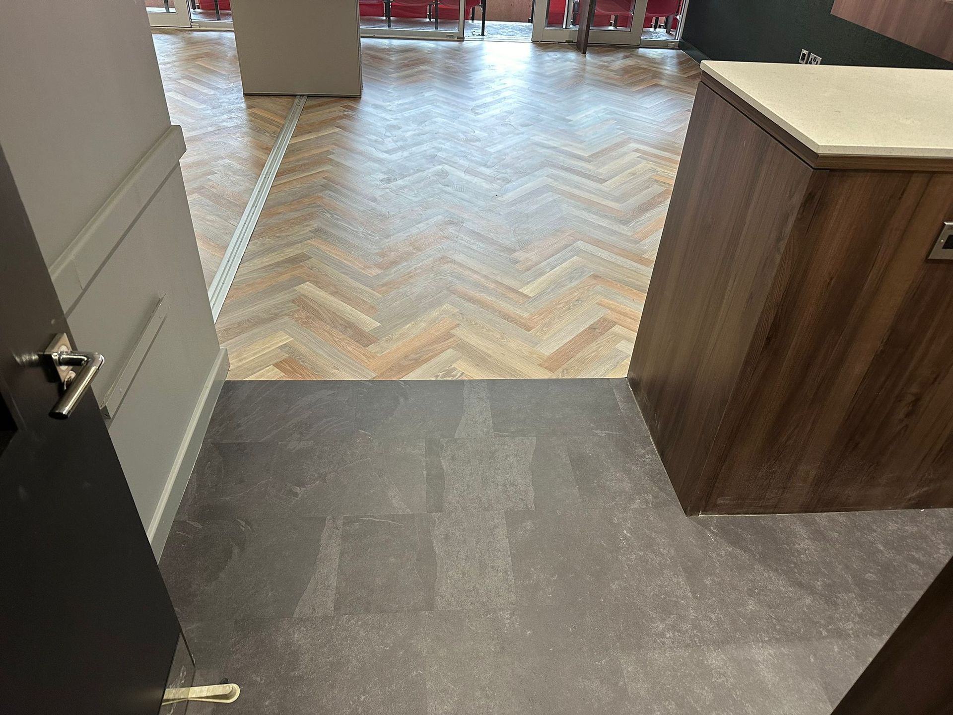 Recent visit to upgrade twin hospitality boxes on level 4 using Karndean Knight Tile in herringbone and slate design to good effect